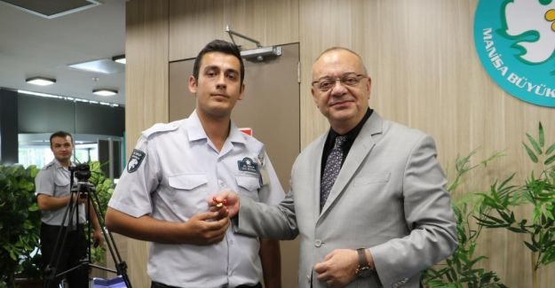 Manisa’da Atatürk Kent Park’ta devriye gezdiği sırada bir vatandaşın cüzdanını ve araç ruhsatını kaybettiğini fark ederek vatandaşa ulaşan ve eşyalarını eksiksiz teslim eden Halit Okar isimli güvenlik personeli, Manisa Büyükşehir Belediye Başkanı Cengiz Ergün tarafından ödüllendirildi. Vatandaşın üzüntüsünü kısa sürede sevince çeviren personelin davranışının herkese örnek olması gerektiğini belirten Başkan Ergün, “Manisa Büyükşehir Belediyesi’ni en iyi şekilde temsil ettiğin için tebrik ediyor ve bundan sonraki görevinde başarılar diliyorum” dedi. Başkan Ergün, güvenlik personelini çeyrek altınla ödüllendirdi.