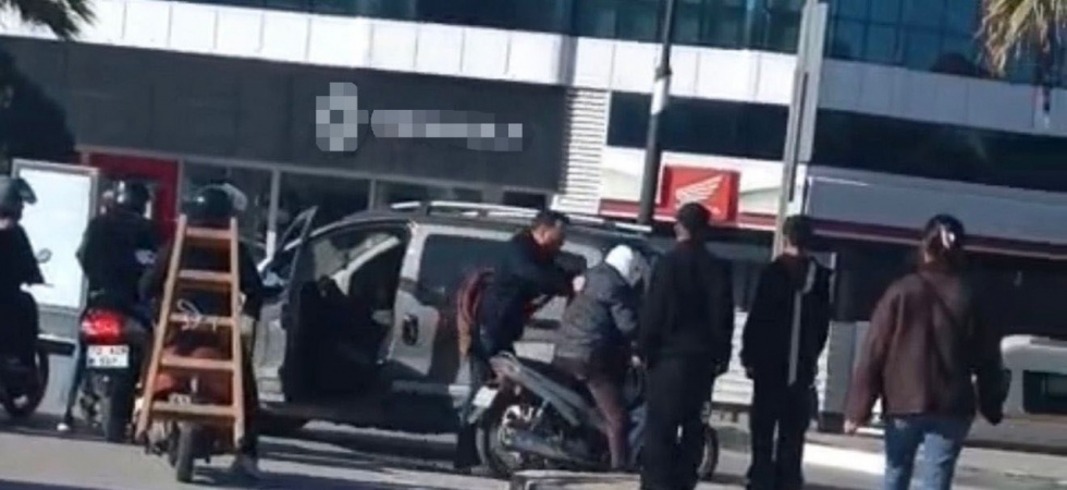 Manisa’nın Turgutlu ilçesinde kavşakta motosikletli ile otomobil sürücüsü arasında geçiş üstünlüğü nedeniyle çıkan kavgada taraflar birbirine girdi. O anlar kameraya yansıdı.