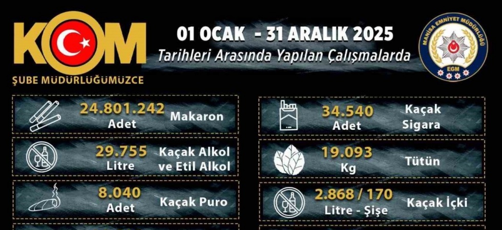 Manisa İl Emniyet Müdürlüğü Kaçakçılık ve Organize Suçlarla Mücadele (KOM) Şube Müdürlüğü ekiplerince 2025 yılı boyunca düzenlenen operasyonlarda 721 şüpheli hakkında işlem yapılırken, 32 kişi tutuklandı. Operasyonlarda 25 milyona yakın kaçak makaron ve tonlarca etil alkol ele geçirilmesi dikkat çekti.