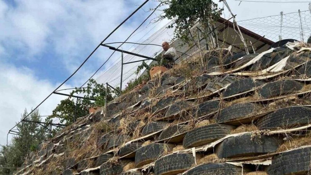 Manisa’nın Sarıgöl ilçesinde bir çiftçi, artık ömrünü tamamlamış olan yüzlerce araç lastiğinden bağ evinin önüne set duvar ördü. Tamamen lastik ve içleri topraktan oluşan geri dönüşümün en güzel örneklerinden birini sergileyen duvar, hem toprak kaymasını önledi hem de çiçek ve sebzelere yuva oldu.