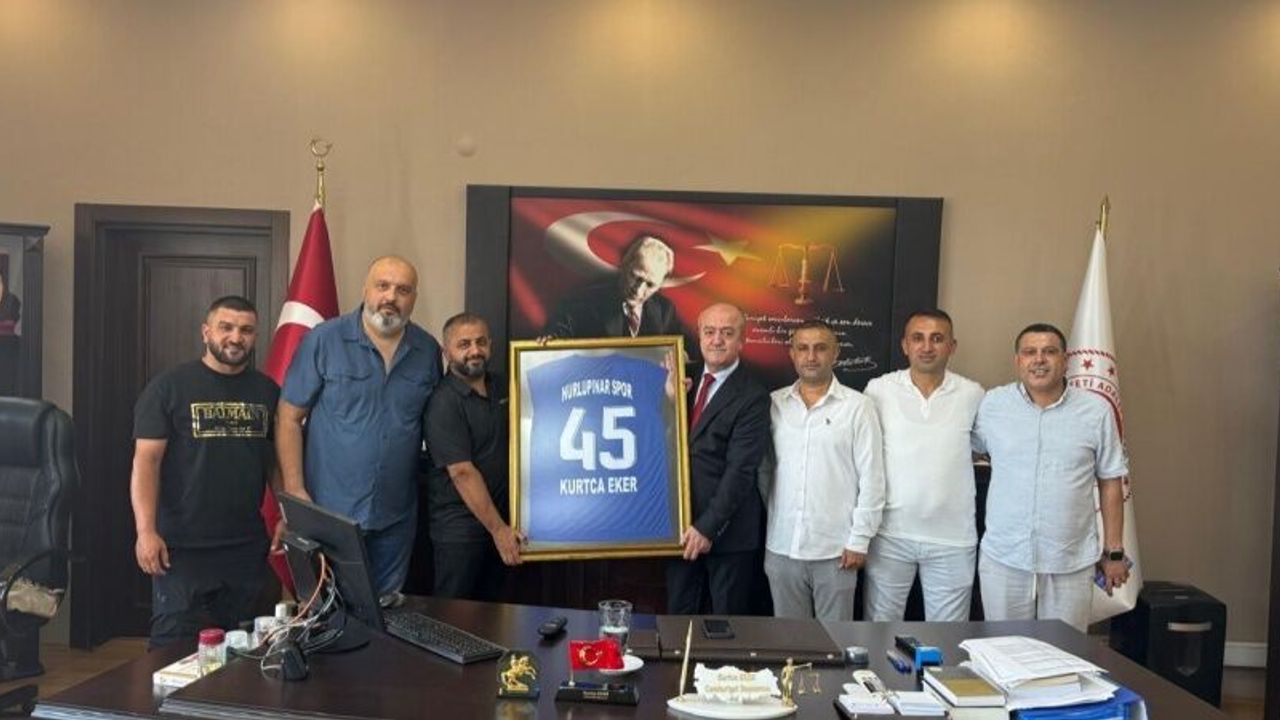 Manisa'nın bölgesel amatör ligde mücadele eden Nurlupınarspor Başkanı Lokman Aran, Manisa Cumhuriyet Başsavcısı Kurtca Eker'i ziyaret etti. Başkan Aran, Başsavcısı Kurtca Eker'e üstünde isminin yazılı olduğu 45 numaralı formayı hediye etti. Ziyarette takımın geleceği hakkında bilgi alışverişinde bulunuldu.