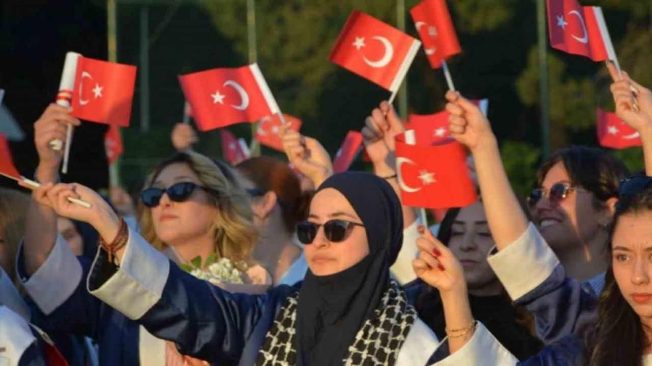 Mezuniyet yürüyüşüne bu yıl mezun olacak 580 öğrencinin yanı sıra Belediye Başkanı Erkan Kara, eşi Nermin Kara, Rektör Prof. Rana Kibar, İlçe protokolü, öğrenciler ve aileleri katıldı.