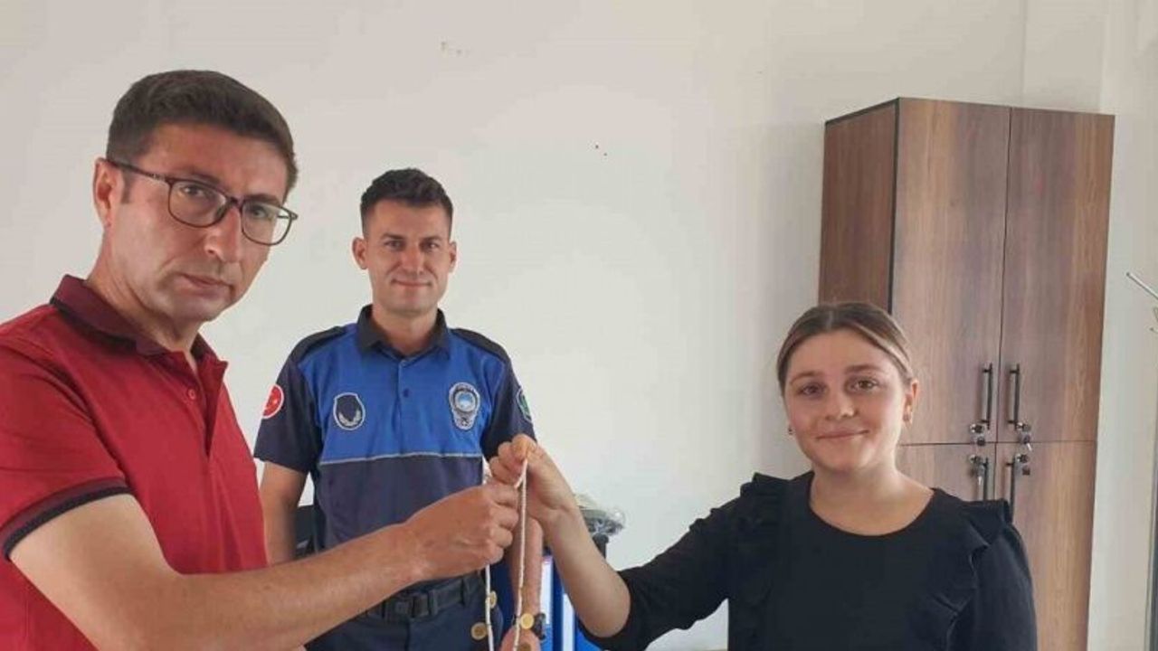 Gençlik Merkezi önündeki durakta boncuklu kolyede dizili 9 adet çeyrek altın bulan Fatma Bostan isimli vatandaş altınları Zabıta Müdürlüğüne getirerek teslim etti.