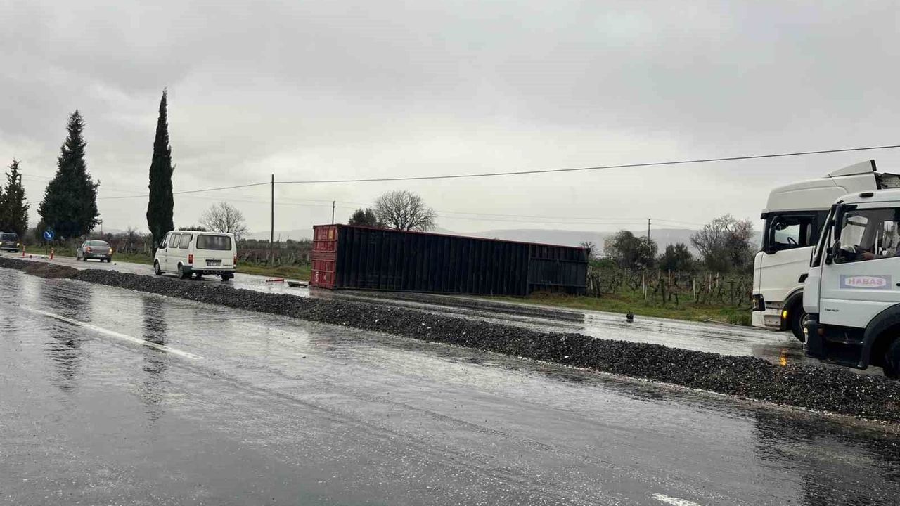 Denizli'de etkili olan yağmur, trafik kazasını beraberinde getirdi. Denizli-Salihli karayolu üzerinde meydana gelen kazada, kayganlaşan yolda kontrolden çıkan bir TIR'ın dorsesi yola savruldu.