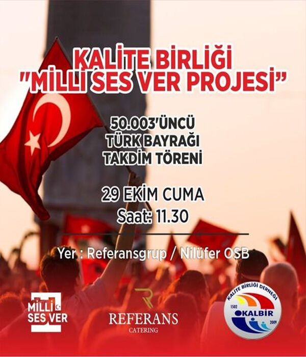 50.003'üncü Türk bayrağı, MİLLİ SES VER PROJESİNE desteklerinden dolayı ve yabancı kuruluşlardan vazgeçerek, 5 ayrı konuda TSE'den yönetim sistemleri belgesi alarak, MİLLİ BELGELENDİRME SİSTEMİNE dahil olan REFERANS GRUP'A, 29 Ekim Cuma günü, saat 11.30'da törenle takdim edilecek...