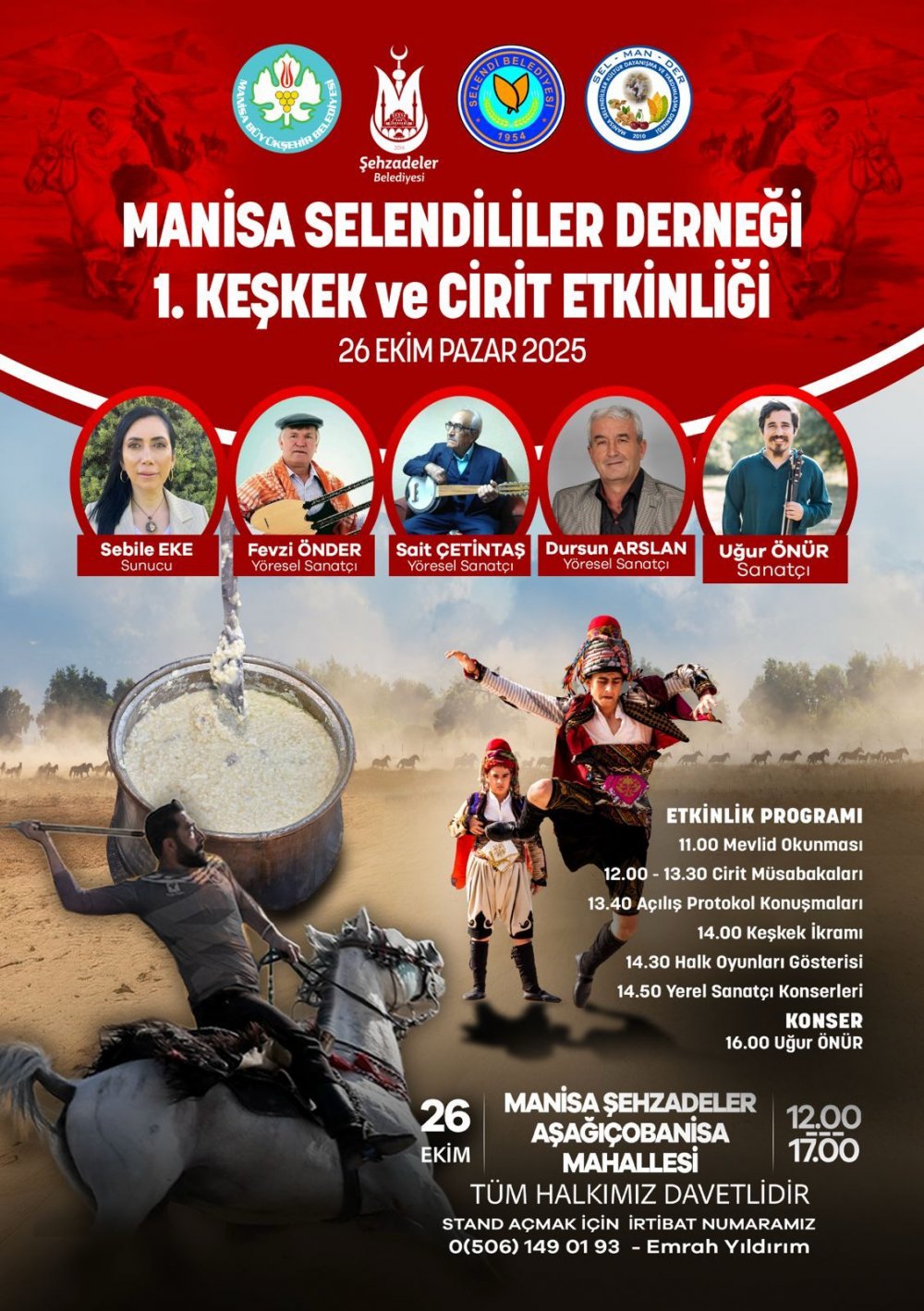 Manisa Selendililer Derneği 1. Keşkek ve Cirit Şenliği 26 Ekim Pazar günü Manisa Şehzadeler ilçesi Aşağıçobanisa mahallesinde yapılacak.