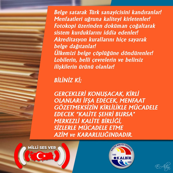 Kalite Birliği'nin bu konuda yapmış olduğu "Milli Ses Çağrılarına" ve oluşturmuş olduğu "Milli Ses Ver Projesine" herkesin destek vermesini arz ve talep ediyoruz.