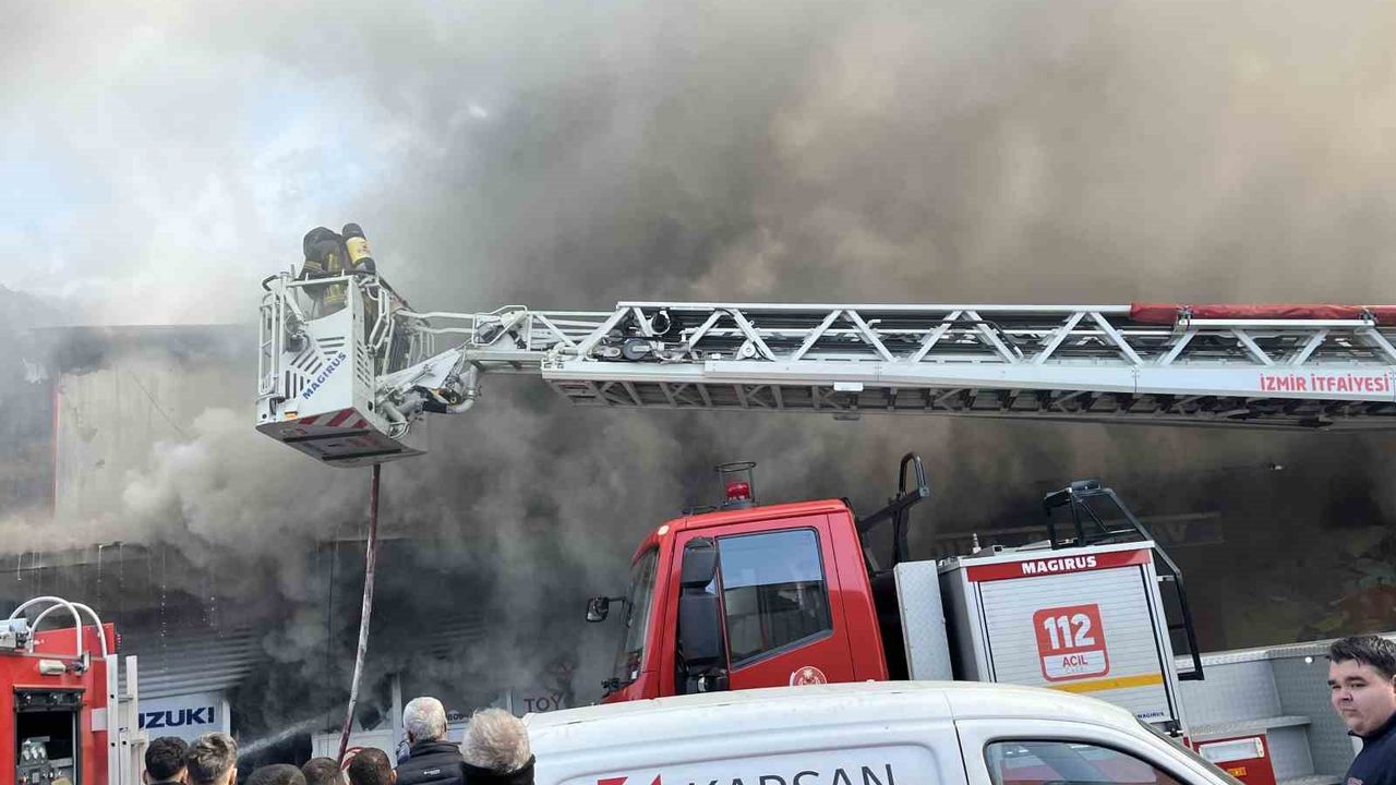 İzmir Buca 6. Sanayi Sitesi'ndeki bir yedek parça dükkanında çıkan yangına itfaiye ekiplerinin alevlere müdahalesi sürüyor.