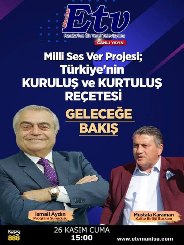 26 Kasım'da Manisa E TV'de, Saat 15.00'de, İsmail AYDIN'ın konuğu olacağız, MİLLİ SES VER PROJESİNİ anlatacağız.
