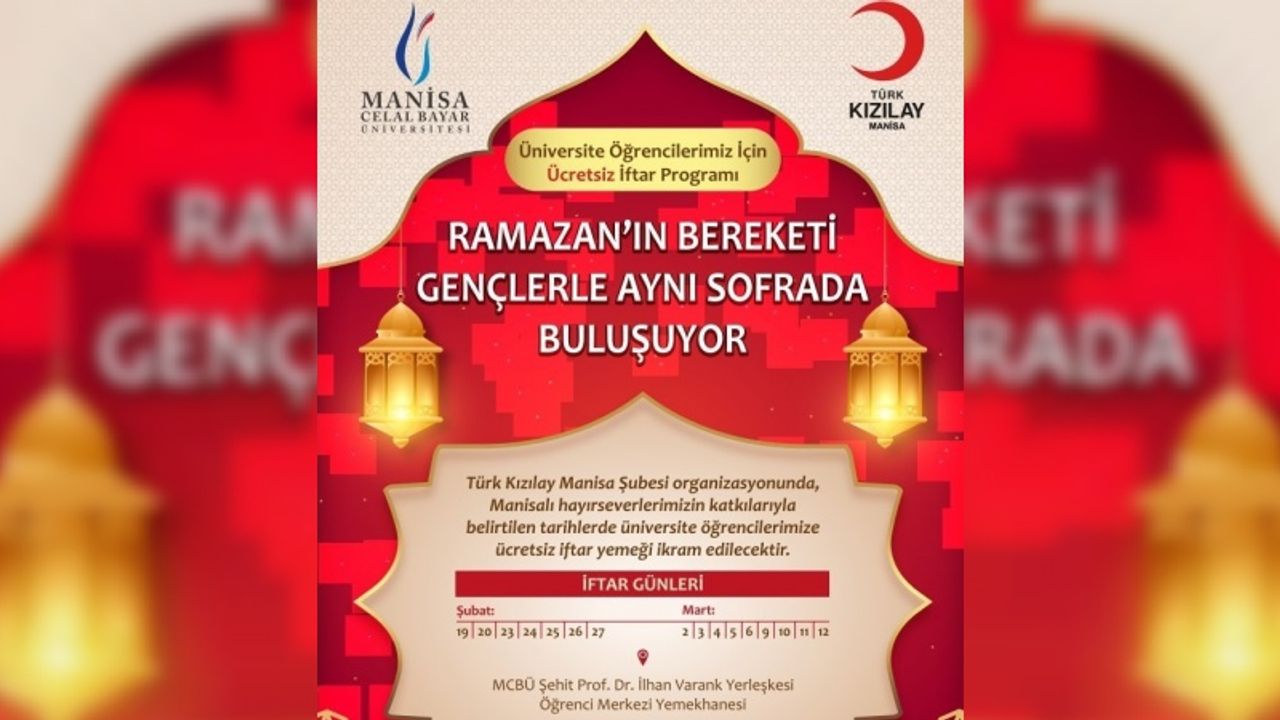 Türk Kızılay Manisa Şubesi tarafından, Manisalı hayırseverlerin katkılarıyla üniversite öğrencilerine yönelik ücretsiz iftar programı düzenleniyor. Ramazan ayının paylaşma ve dayanışma ruhunu yaşatmayı amaçlayan organizasyon kapsamında, belirlenen tarihlerde öğrencilere 16 gün ücretsiz iftar yemeği ikram edilecek.
