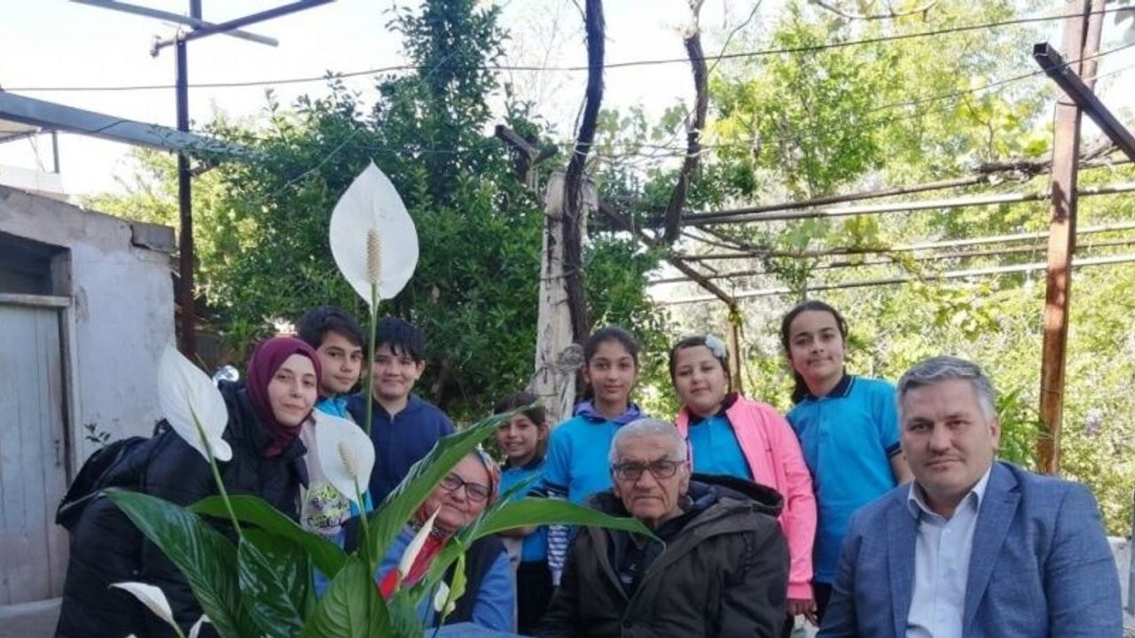 Okul Müdürü Veysel Çetin tarafından emekli öğretmen Vehbi Sarıhan’a ziyaretin hatırasına çiçek hediye edilirken, emekli öğretmen Vehbi Sarıhan da yapılan ziyaretten duyduğu memnuniyeti belirterek çocuklara okul hayatlarında başarılar diledi.