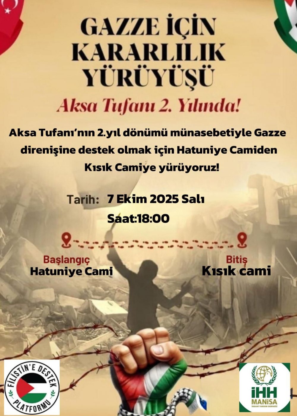 Manisa Filistin’e Destek Platformu, 7 Ekim 2025 günü saat 18:00’de Hatuniye Camii önünden başlayarak Kısık Camii’ye kadar sürecek bir yürüyüş çağrısında bulundu. Etkinliğe katılacak olan Manisalılar, Filistin halkına desteklerini göstermek ve Filistin’deki zalim saldırılara karşı duruş sergilemek amacıyla ellerinde bayraklarla bu anlamlı yürüyüşte buluşacak.