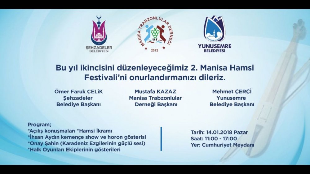 Manisa’da Trabzonlular Derneği tarafından 2.si düzenlenecek olan Hamsi Festivali'ne bu yıl renkli simalar Manisa'yı coşturacak. Sevilen isim Karadenizli Türkücü Onay Şahin, Karadeniz Folklor Ekibi