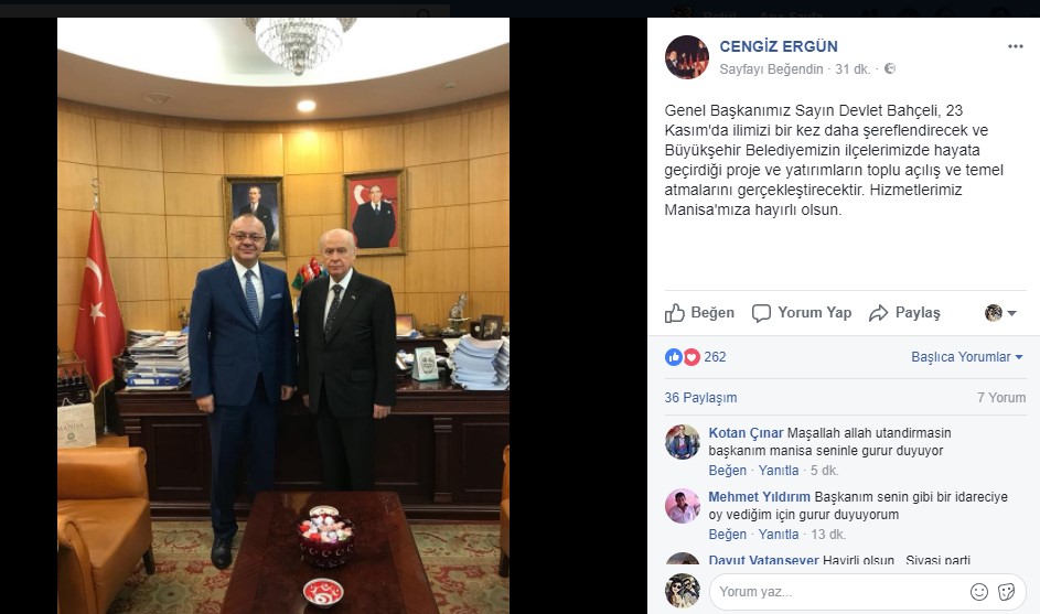 Manisa Büyükşehir Belediye Başkanı Cengiz Ergün, Bahçeli'nin Manisa'ya ziyaret edeceğini sosyal medya hesabı facebook sayfasından duyurdu. Başkan Ergün'ün paylaşımı ise şöyle;