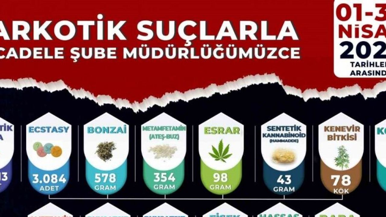 Gerçekleştirilen operasyonlarda çok sayıda uyuşturucu madde ve suç unsuru ele geçirildi. Nisan ayında yapılan operasyonlarda, 68 bin 113 adet sentetik ecza, 3 bin 84 adet ecstasy, 578 gram bonzai, 354 gram metamfetamin (ateş-buz), 98 gram esrar, 43 gram sentetik kannabinoid (ham madde), 78 kök kenevir bitkisi, 30 gram kokain, 26 gram amfetamin ele geçirildiği açıklandı.
