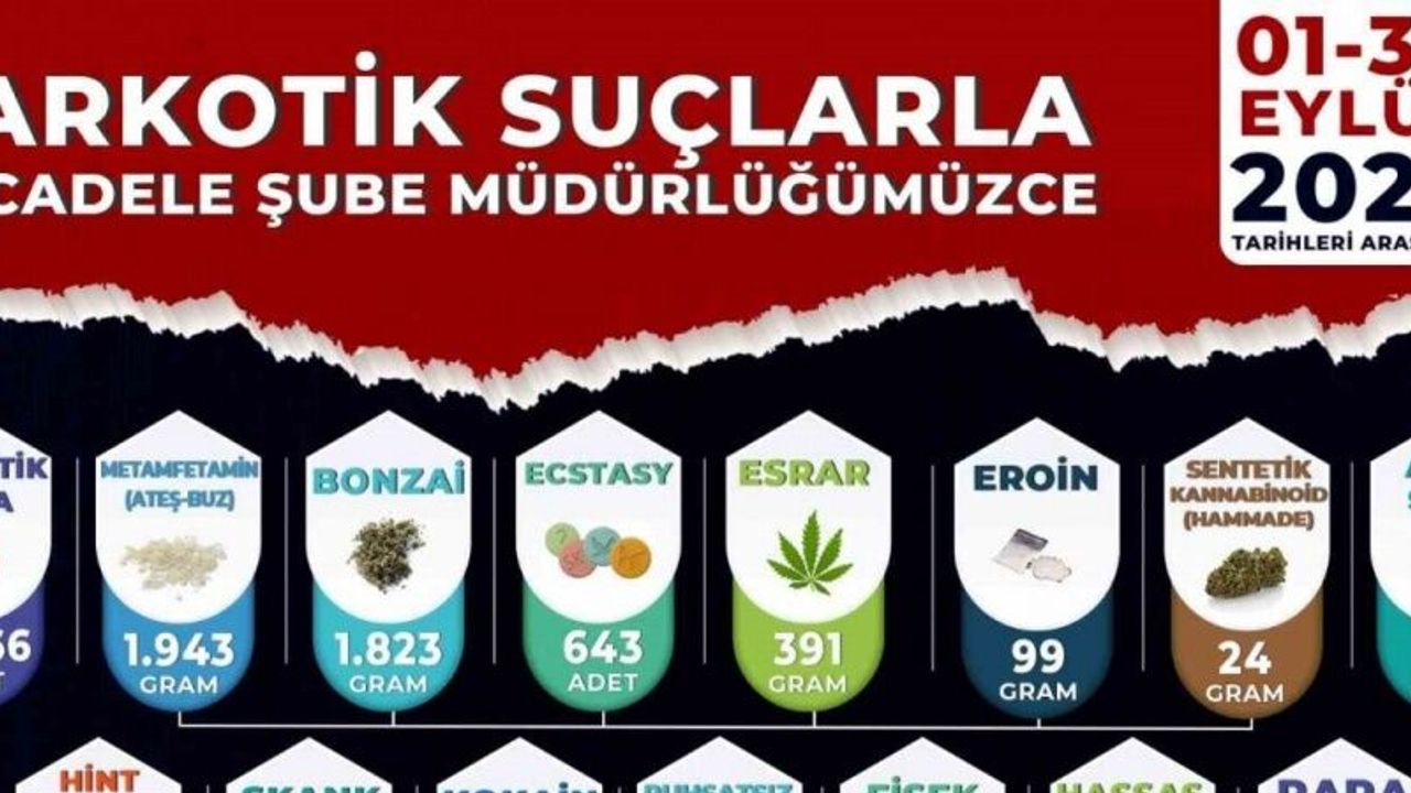 Manisa İl Emniyet Müdürlüğü Narkotik Suçlarla Mücadele Şube Müdürlüğü koordinesinde, Akhisar, Alaşehir, Salihli, Soma ve Turgutlu NSM Büro Amirliklerinin desteğiyle 1-30 Eylül 2025 tarihleri arasında yürütülen çalışmalar sonucunda 387 olay meydana gelirken, 477 şüpheli yakalandı. Şüphelilerden 56’sı tutuklanırken, 72 aranan şahıs da yakalandı. Yapılan operasyonlarda; 11 bin 966 sentetik ecza (hap), bin 943 gram metamfetamin, bin 823 gram sentetik kannabinoid (bonzai), 643 ecstasy hap, 391 gram esrar, 99 gram eroin, 24 gram sentetik kannabinoid hammaddesi, 23 gram afyon sakızı, 12 kök hint keneviri, 1 gram skank, 2 gram kokain, 2 ruhsatsız tabanca, 74 fişek, 4 hassas terazi ve uyuşturucu madde ticaretinden elde edildiği değerlendirilen 46 bin 455 TL para ele geçirildi.