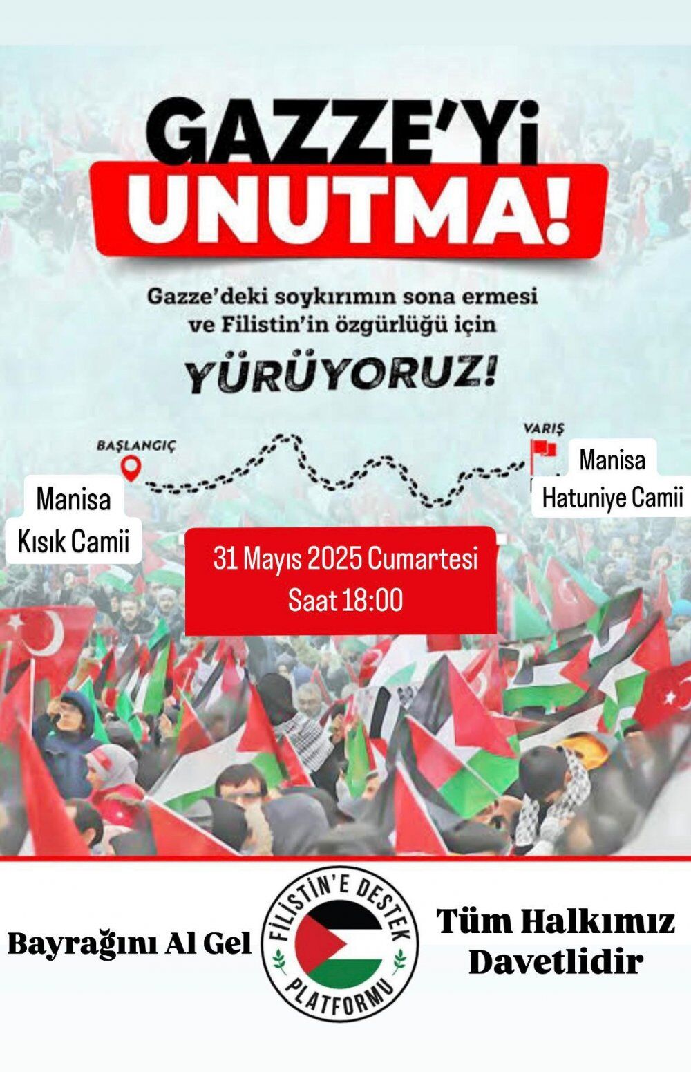 Manisa Filistin’e Destek Platformu, İsrail’in Filistin’de sürdürdüğü insanlık dışı saldırılara karşı toplumsal duyarlılığı artırmak ve mazlum Filistin halkının yanında olduklarını göstermek isteyen tüm vatandaşları yürüyüşe davet ediyor.