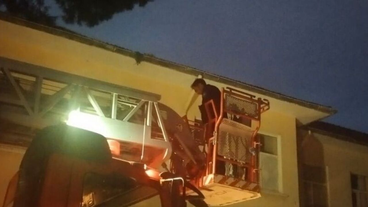 Manisa’nın Salihli ilçesinde okul çatısında mahsur kalan kedi, itfaiye ekiplerinin çalışmasıyla kurtarıldı.
