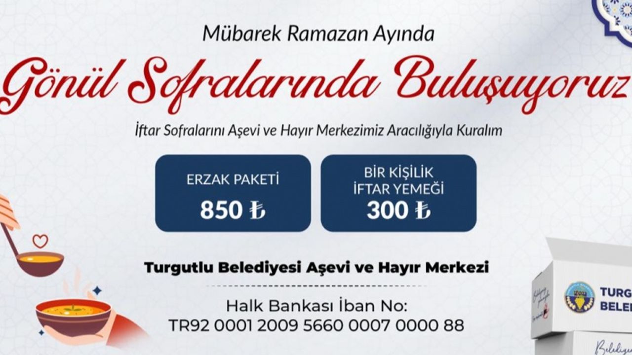 Turgutlu Belediyesi tarafından insan odaklı sosyal belediyecilik anlayışıyla hayata geçirilen ‘Mübarek Ramazan Ayında Gönül Sofralarında Buluşuyoruz’ yardım kampanyasıyla hayırseverler ile ihtiyaç sahipleri arasında dayanışma köprüleri kurulacak. Ramazan ayı boyunca devam edecek kampanyada bir kişilik iftar yemeği bedeli 300 TL, bir aile için erzak paketi bedeli ise 850 TL olarak belirlendi.