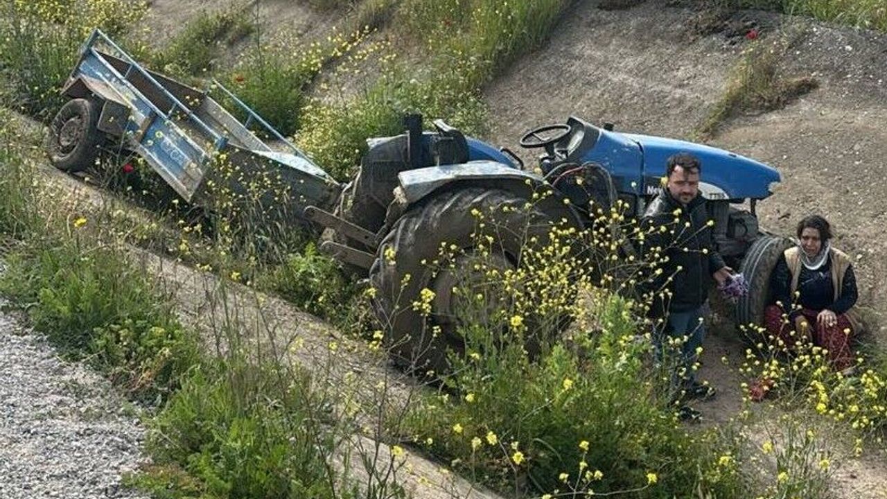 Manisa'nın Turgutlu ilçesinde ön lastiği çıkan traktörün takla atarak kanala savrulması sonucu 2 kişi yaralandı.
