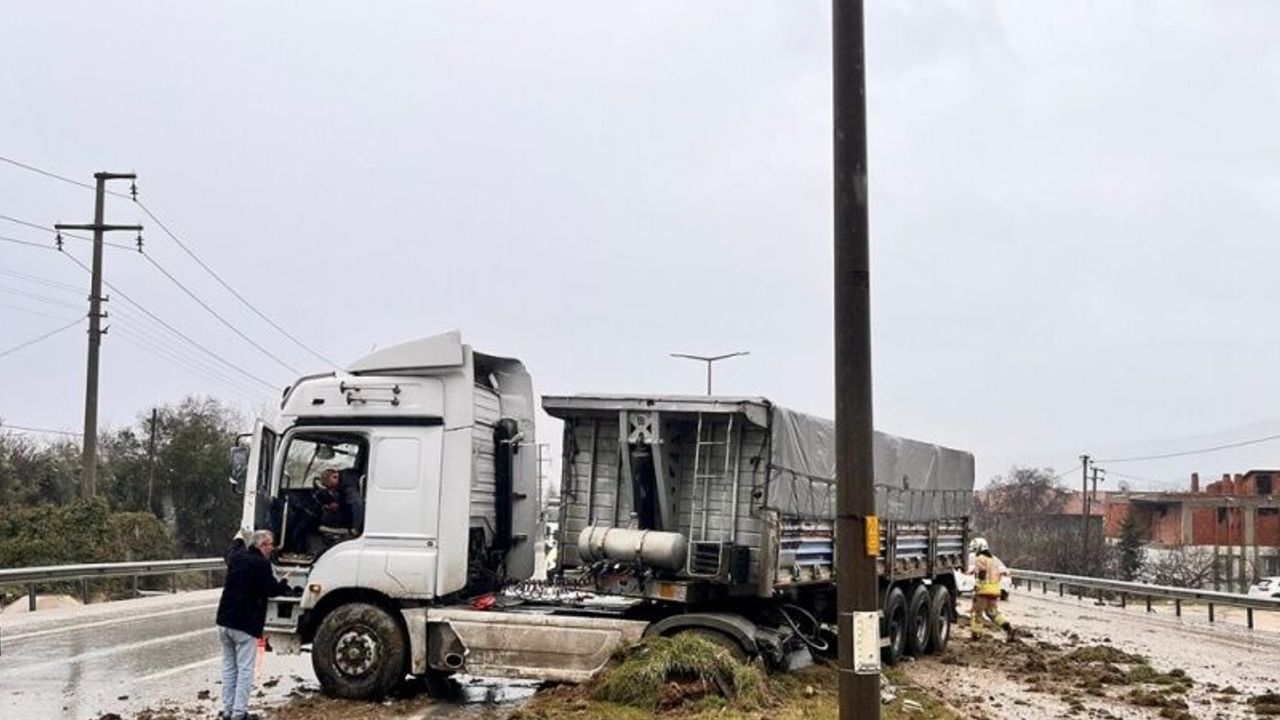 Manisa’nın Kula ilçesinde yağışlı havanın da etkisiyle kayganlaşan yolda sürücüsünün kontrolünden çıkan tır orta refüje çıkarken kazada sürücü yara almadı.