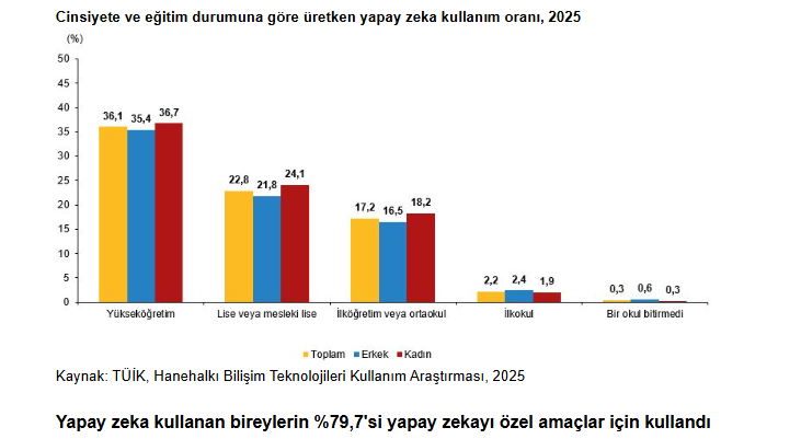 Türkiye’de yapay zekâ kullanımında en büyük payı özel amaçlar oluşturdu. TÜİK verilerine göre yapay zekâyı kullananların %79,7’si özel amaçlarla, %33,8’i mesleki amaçlarla ve %31,4’ü örgün eğitim için yararlandı.
